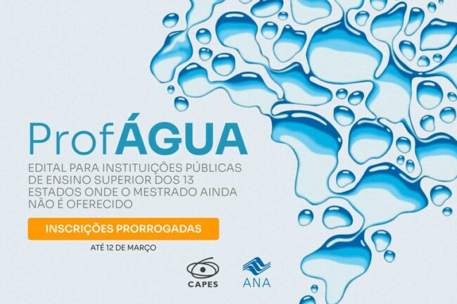 O ProfÁgua prorrogou até 12 de março o prazo para receber propostas de adesão de instituições públicas de ensino superior públicas interessadas em oferecer o Mestrado Profissional em Gestão e Regulação de Recursos Hídricos. A Pró-Reitoria de Pós-Graduação ou instância equivalente da instituição de ensino superior proponente deverá encaminhar a proposta ao Presidente do Conselho…